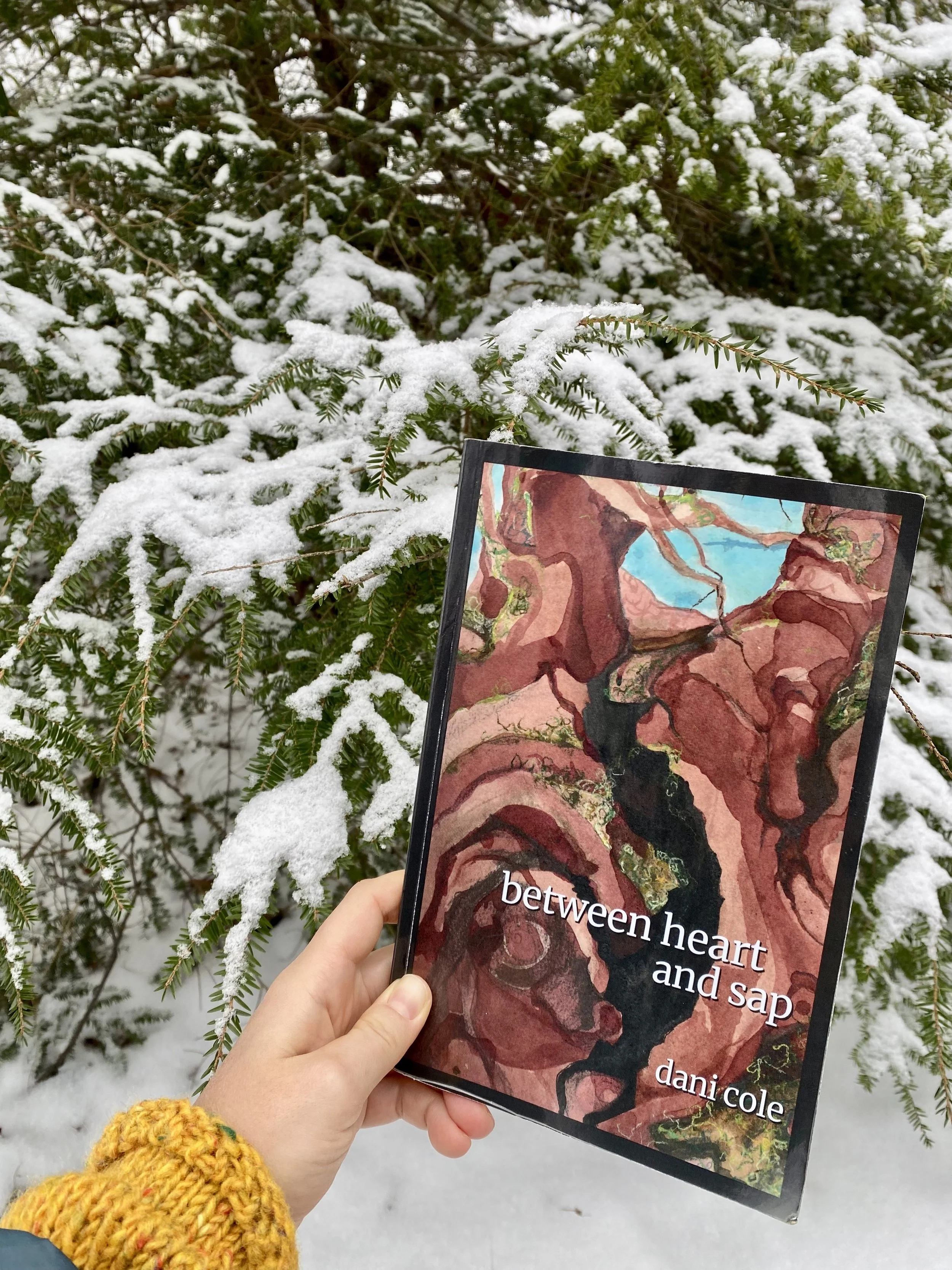 “Before I learned that Dani Cole was a writer, I knew of their work in dance and improvisation. between heart and sap speaks the language of a body continuous with other beings of Earth, not one claiming dominion. As suggested in their poem, “untitled,” Cole allows the sensibilities of bodies to reimagine, reshuffle, and ultimately transform the way we read and understand. There’s a deliberate, surreal choppiness to this poetry’s sound and sense, an anti-rhythm keeping Cole’s readers alert, on edge, unable to settle into any comfortable roll. These roughly cut poems sport textures of bark and bumps of bone beneath skin, not the flat smoothness of elegant marks on paper. Their lines are puzzle pieces firmly brushing your hand aside as they gather themselves according to their own lights.”